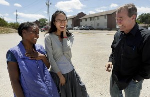 Mike Bickle talks with Ondrea Johnson(cq)(L) and Kyou Ahn, of South Korea, outside IHOP Wednesday. Johnson is part of IHOPU and Ahn is an intern.
