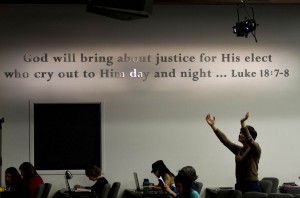 Congregation members sing and praise the Lord in the IHOP prayer room Wednesday. It’s not uncommon to see people standing, kneeling or even dancing as they participate in the worship in the IHOP prayer room.