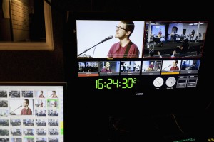 Becky Pratts and Jordan Greve(both not pictured) work in the broadcast room at IHOP preparing the video feeds for broadcast in the media trailers at IHOP Wednesday.