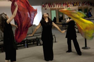 IHOP dancers Jeanette Dykstra(c) and Anne Delpuech(c) and Me’ira Lynne (NO LAST NAME GIVEN) praise the Lord through dance at the back of the prayer room at IHOP Wednesday. There is a dedicated area for dancing in the prayer room.