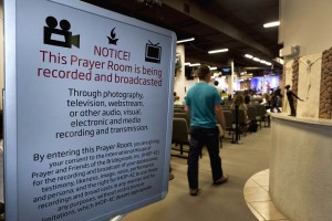 A notice at the entrance of the prayer room tells visitors that the event is being recorded and broadcast across the internet. There are many cameras in the room recording the events.