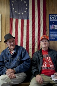 J.D. Sutterfield(left) and Rip Bonds(right) wait for their mail to be put into their PO boxes Friday at the Fox, AR post office. The two said they do not want to get a mailbox they want their post office to stay open.
