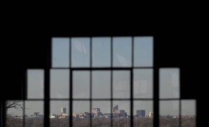 Downtown Wichita, KS can be seen through the windows of the Kansas Aviation Museum. The land and buildings that now make up the Museum was the location of Wichita’s original airport. It was all around this area of south east Wichita that the aviation industry grew up many decades ago.