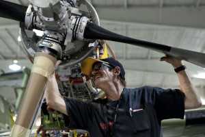 Roger Pierce works on assembling a prop on a Beechcraft Kingair 350 in Hanger 4 at Hawker Beechcraft Wednesday morning. Pierce has been assembling aircrafts for 24 years at Hawker Beechcraft.